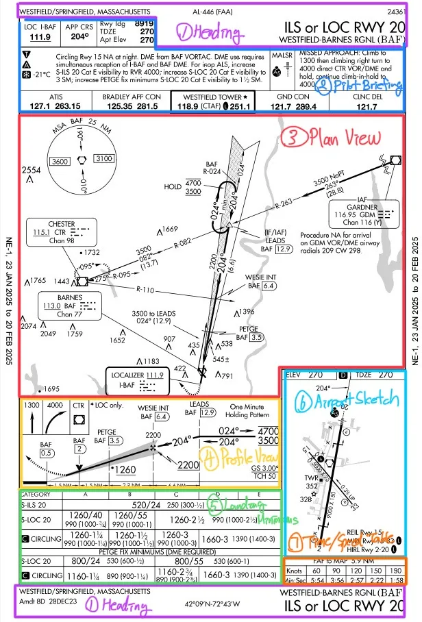 - identify FAF: precision (light-bolt), non-precision (maltese cross)