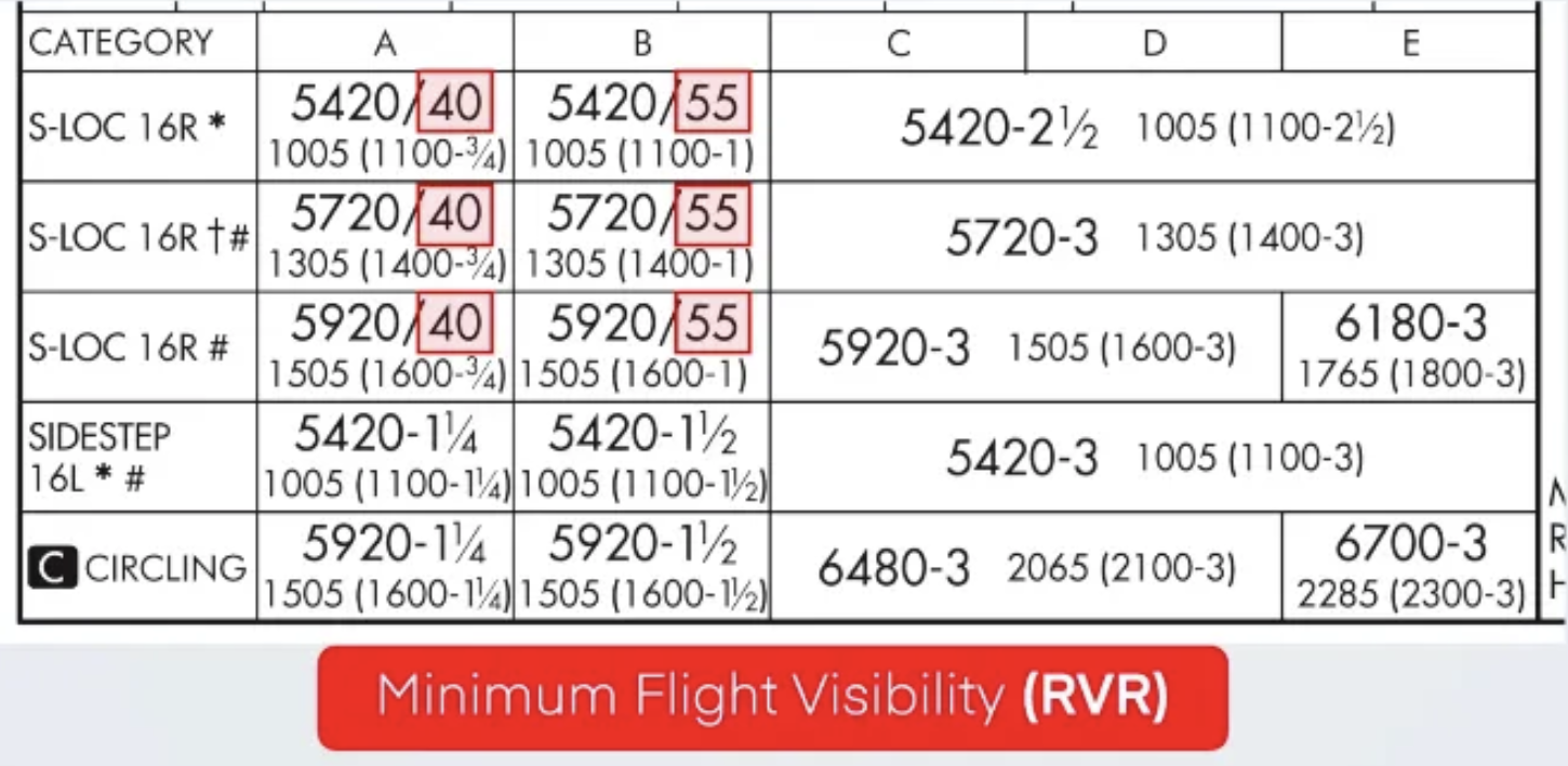 - circling: course alignment↔rwy center exceeds 30°, approach name not include rwy (VOR/DME-B), remain 1.3NM (for category A) radius of all runways (B1.5, C1.7, D2.3, E4.5), visual ref lost while circling? (climbing turn to landing rwy → continue turn until established on missed course)